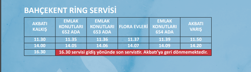 Şuan sadece 3 servis bulunmakta. Bahçekent’in artan nufüs ve talep ile birlikte servis saatleri arttırılacak.