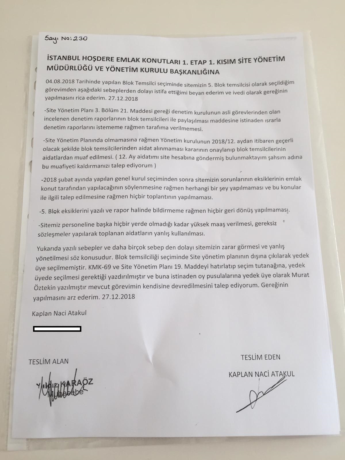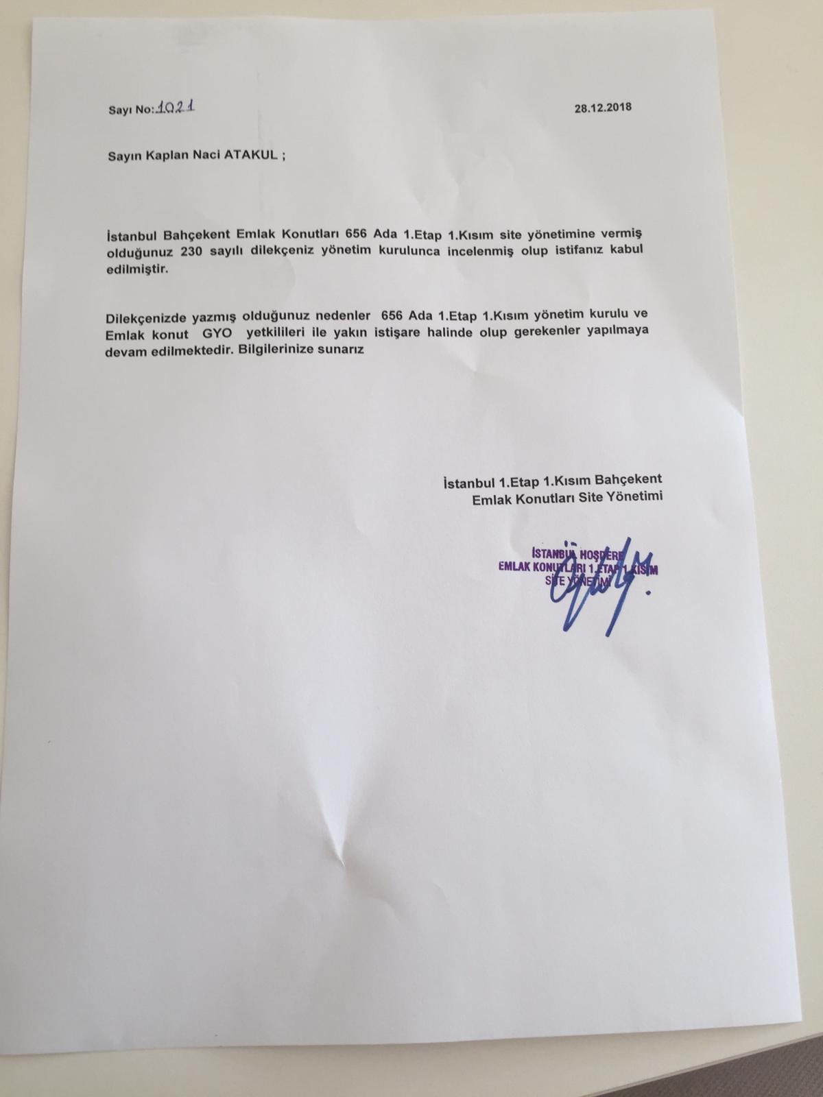 Bahçekent Emlak Konutları 656.Ada sitesinin 5.Blok temsilcisi Kaplan Naci Atakul bugün itibariyle görevinden istifa etti. 4 Ağustos 2018 tarihinde yapılan blok temsilcisi seçiminde 5.blok temsilcisi olarak seçilen Atakul, verdiği istifa dilekçesinde istifa sebeplerini de ekledi.